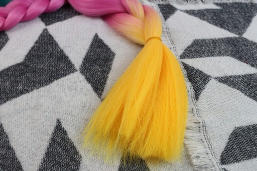Włosy syntetyczne w przepięknym wariancie kolorystycznym - zielono-różowo-żółtym. Wykonane z gładkiego i przyjemnego w dotyku henlonu.