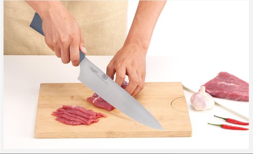 - Nóż kuchenny 8" – uniwersalne narzędzie, najlepiej sprawdzi się przy krojeniu mięsa lub wędlin