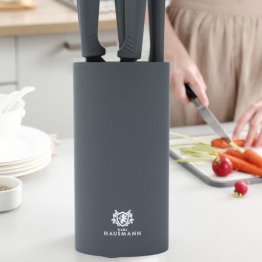 Twarde noże długo zachowają ostrość, jednocześnie są trudniejsze w ostrzeniu, mniej giętkie i bardziej podatne na pęknięcia oraz wykruszenia. Każdy nóż powinien być sztywny, aby precyzyjnie kroić różne składniki, z drugiej zaś strony musi być na tyle elastyczny, by podczas zmiany kąta krojenia lub dużego nacisku, nie pękał. Twardość ostrzy noży kuchennych KARL HAUSMANN została tak dostosowana, aby zapewnić niezwykle precyzyjne i ostre cięcie, a jednocześnie zminimalizować prawdopodobieństwo złamania się ostrza podczas intensywnego użytkowania.
