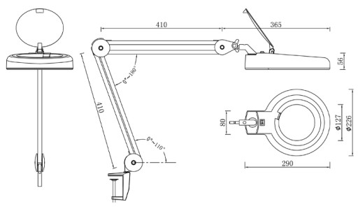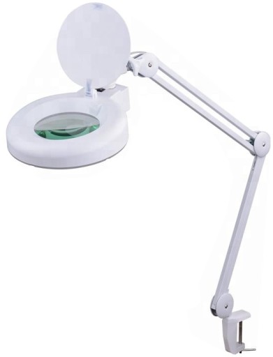 Lampa z lupą przeznaczona jest do pracy na blacie stołu. Powiększenie obserwowanego obiektu realizowane jest przy pomocy szklanej soczewki o średnicy 127mm i powiększeniu optycznym 5D. Powiększenie 5 dioptrii to ok. x2,25. W celu zwiększenia komfortu pracy wokół soczewki umieszczono 60 sztuk jasnych diod LED w technologi SMD oświetlającej równomiernie pole robocze. Dzięki równomiernemu rozmieszczeniu diod LED źródło światła nie rzuca cieni. Zaletą zastosowania diod LED jest ich niski pobór mocy (energooszczędne), oraz brak efektu nagrzewania. Lampa wyposażona jest z zamykaną osłonę soczewki. Lampę z powodzeniem można także wykorzystać jako zwykłą lampę biurkową.