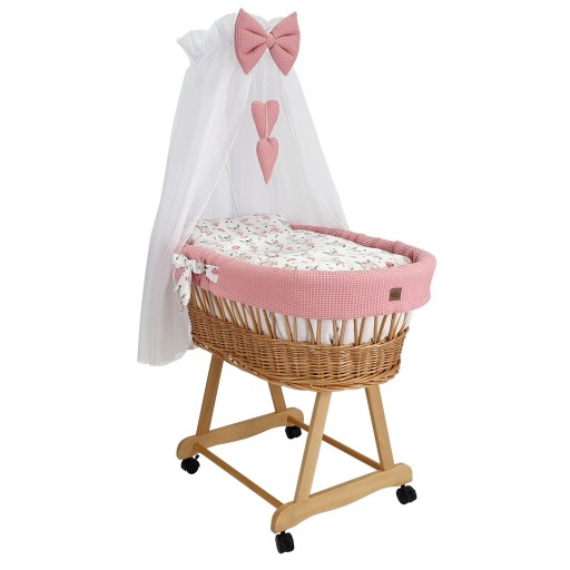 KOSZ MOJŻESZA — dedykowany niemowlakom do szóstego miesiąca życia. Ze względu na nieduże gabaryty i owalny kształt, otula maleństwo z każdej strony, dając mu poczucie bezpieczeństwa. Piękny, ręcznie pleciony, produkowany w Polsce produkt. W komplecie ze starannie wykonanym obszyciem, pościelą i materacykiem. Drewniane podwozie na kółeczkach pozwala na łatwe przemieszczanie go.