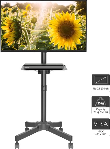 - UNIWERSALNY STOJAK NA TELEWIZOR NA KÓŁKACH: Nasz mobilny stojak na telewizor z elastycznym mocowaniem pasuje do większości płaskich zakrzywionych ekranów LCD LED o przekątnej 23–60 cali i wadze do 25 kg; Kompatybilny z otworami VESA: 400x400 / 400x300 / 400x200 / 300x400 / 300x300x300x30x30 0 / 30.0x200 / 200x200 / 200x100 / 100x100 / 50x50 mm. Przed zakupem potwierdź specyfikację VESA, wagę i rozmiar telewizora