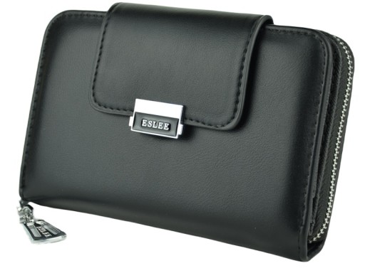 Portfel składa się z części zamykanej na zamek, oraz części zamykanej na zatrzask
