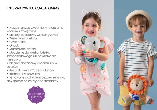 Koala Kimmy to urocza, pluszowa zabawka, która towarzyszy dziecku w zabawie w domu i w podróży. Dzięki różnorodnym teksturom, grzechotkom i gryzakom wspiera rozwój sensoryczny i motoryczny maluszka, zachęcając go do odkrywania świata! 🌍✨