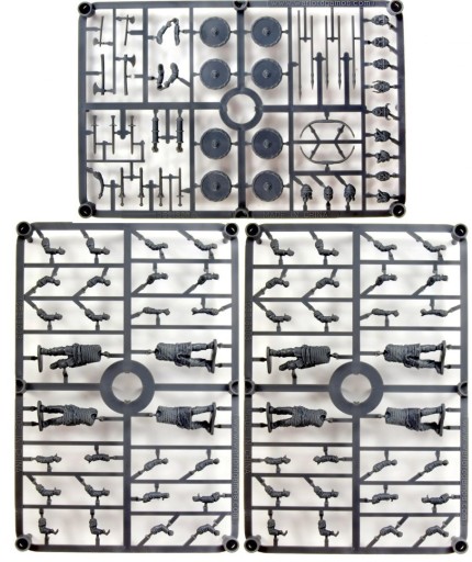 Trzy wypraski (dwie z wojownikami, jedna z bronią i głowkami)