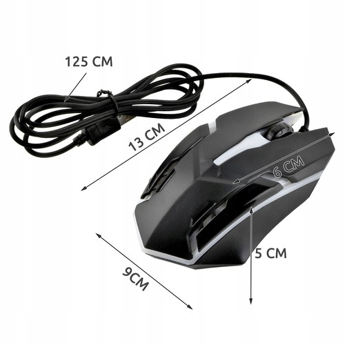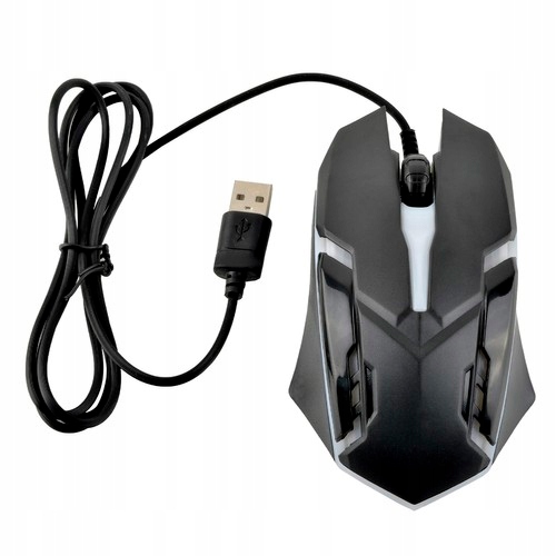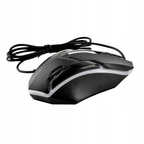 - SPECYFIKACJA - typ myszy: optyczna, przewodowa; podświetlenie: multicolor; DPI: 1200; interfejs: USB; zasilanie: 5V 100mA; liczba przycisków: 3+scroll; wymiary (dł/szer/wys): 12,5/7/3,5cm; długość kabla: 115cm; waga: 110g