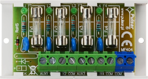 - zadziałanie bezpiecznika sygnalizowane jest poprzez zgaszenie odpowiedniej diody LED modułu: L1 dla AUX1, L2 dla AUX2 itd.,