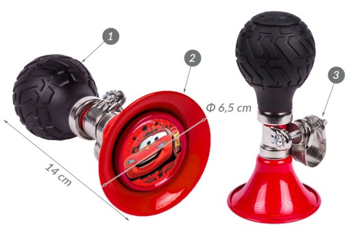 Trąbka ozdobiona jest bohaterami z bajek Disney'a co sprawia małemu rowerzyście dodatkową radość z jazdy na rowerze.
