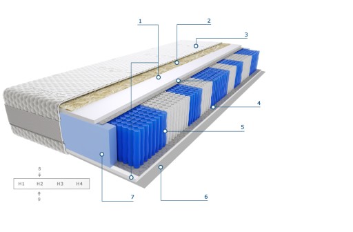 2 - Sprężyny kieszeniowe Multipocket 9 stref (510szt/1m2) - Wszystkie nasze materace zbudowane są ze sprężyn kieszeniowych. W przypadku sprężyn kieszeniowych multipocket ilość sprężyn ulega prawie podwojeniu – tutaj mamy 510szt/1m2. Taka ilość sprężyn to 2 razy więcej punktów podparcia naszego ciała. Jeszcze lepsza jakość snu oraz zwiększona żywotność materaca. Sprężyny kieszeniowe to zbiór pojedynczych sprężyn, każda z nich jest umieszczona w osobnym materiale, tzw. kieszeni. Dzięki temu nie słychać pracy sprężyn oraz wyeliminowany jest problem zsuwania się osoby lżejszej na cięższą jak to ma miejsce w przypadku sprężyn bonellowych.