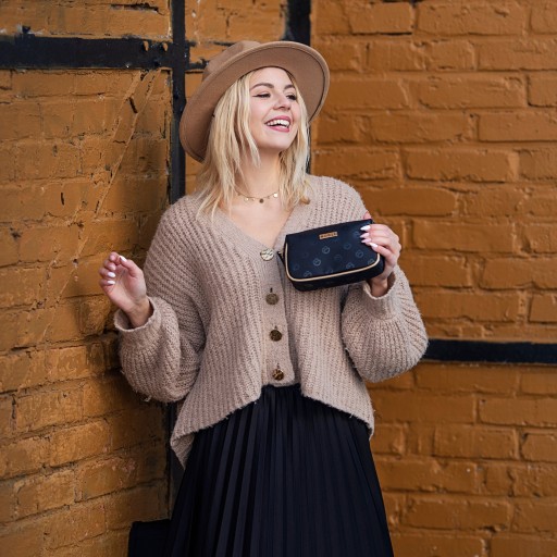 Dodatki w kolorze złotym znakomicie harmonizują z ciemnym brązem materiału kosmetyczek. Podczas projektowania tej kolekcji zadbano o każdy drobiazg w tym odcień złota doskonale komponujący się z całością.