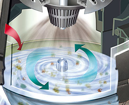 Innowacyjnym rozwiązaniem decydującym o niezwykłej skuteczności Robocleana jest wirujący z prędkością od 7,5 do 19 tys. obrotów na minutę separator osadzony na wirniku silnika. To właśnie dzięki temu nawet najdrobniejszy kurz jest dosłownie wbijany w wodę, a powietrze wydostające się z urządzenia jest naprawdę czyste.