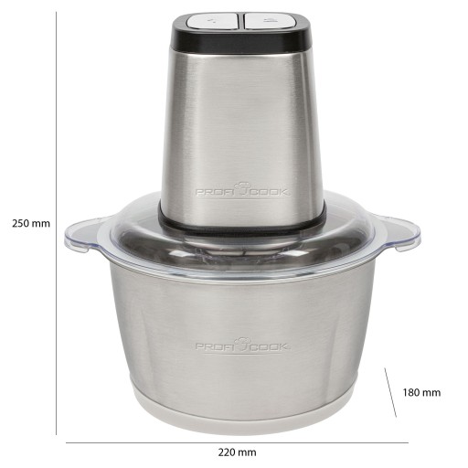 ProfiCook PC-MZ to wysokiej jakości rozdrabniacz, który pozwala na siekanie różnego rodzaju produktów spożywczych w większych ilościach. Silnik o mocy 500 W oraz ostrza w konfiguracji z 2 lub 4 nożami ze stali nierdzewnej poradzą sobie również z twardszymi produktami takimi jak lód czy twarde orzechy. Konstrukcja urządzenia pozwala na obsługę przy użyciu jednej ręki. Siekacz wyposażony jest w pojemnik ze stali nierdzewnej o pojemności 1700 ml dzięki czemu urządzenie pomoże również w przygotowaniu większych potraw.