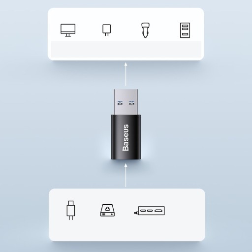 ⚡ Wyprodukowana przez firmę Baseus niewielka przejściówka ze złącza USB 3.1 na USB Typ C. Wykonane z wysokiej jakości materiałów praktyczny adapter umożliwiający podłączenie do zwykłego portu USB szeregu akcesoriów z wtyczką USB Type-C.