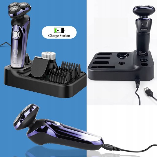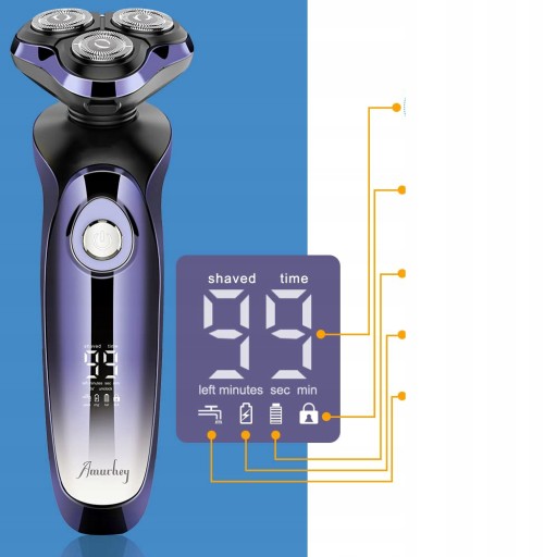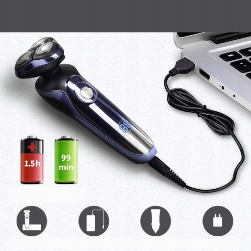 【Stacja ładująca i ładująca USB wyświetlacz LCD】 [Nie obejmuje adaptera] Ładowanie USB, ładowanie 1,5 godziny przez 99-120 minut czasu pracy. Wyświetlacz LCD pokazuje czas golenia, pozostałą moc, przypomnienie o ładowaniu i przypomnienie o czyszczeniu. Naciśnij przycisk przez 3 sekundy, golarka przejdzie w tryb blokady.