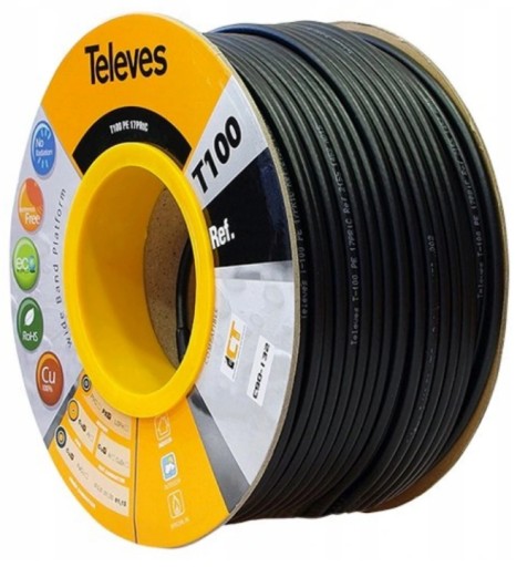Żyła wewnętrzna (rdzeń) kabla Televes T-100 o średnicy 1,13mm wykonany jest z czystej miedzi. Folia ekranująca oraz oplot kabla wykonany z aluminium o pokryciu 77% co zapewnia pełną zgodność ze standardem Klasy A. Kabel posiada bardzo dobre parametry tłumiennościowe, więc można go stosować w instalacjach do 3GHz.