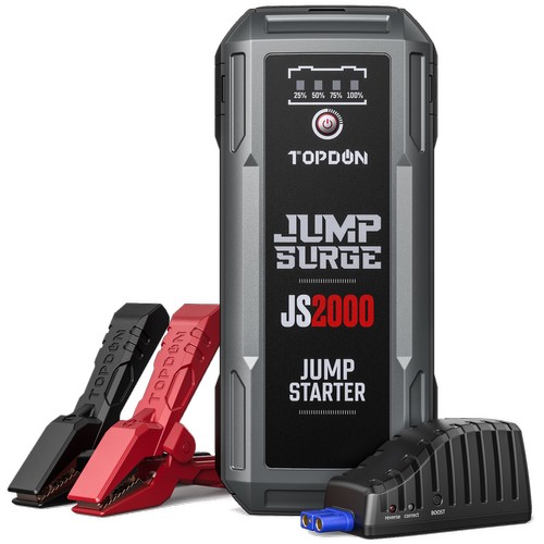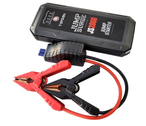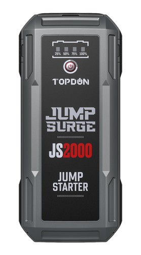 Jump Starter JumpSurge2000 firmy TOPDON to urządzenie rozruchowe i power bank 2000 Peak Amp do samochodów, ciężarówek, łodzi, motocykli i nie tylko. Obsługuje pojazdy z akumulatorami 12V i silnikami benzynowymi (do 8L) oraz Diesel (do 6L).