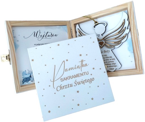 Drewniany Anioł ma wymiary 12x12cm i wygrawerowaną modlitwę "Anioł Stróż " Można go wyjąć i zawiesić w pokoiku dziecka. Ta wyjątkowa pamiątka będzie miłym wspomnieniem a także niezwykłą pamiątką bo pudełeczko może służyć potem jak schowek na drobiazgi.