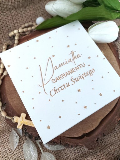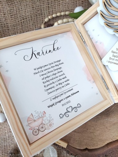Drewniane pudełeczko z personalizowanymi życzeniami i modlitwą