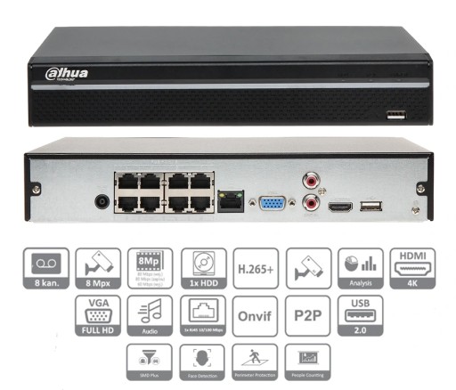 Rejestrator Dahua to nowoczesne urządzenie sieciowe, które zostało zaprojektowane do kompleksowej obsługi kamer wysokiej w bardzo wysokiej rozdzielczości. Pozwala na współpracę z 8 kamerami IP, które przetwarzają obraz w rozdzielczości ULTRA HD do 12Mpx (4000x3000).