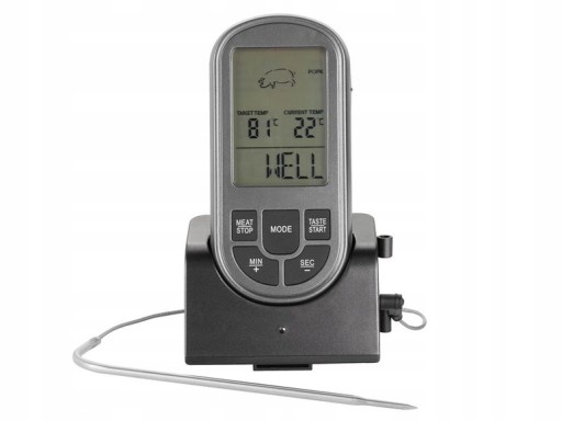 Termometr posiada przejrzyste wskazówki dotyczące wyboru odpowiedniej temperatury w zależności od rodzaju mięsa i żądanego stopnia wypieczenia. Wyposażony również w możliwość ręcznego ustawienia zgodnego z własnymi preferencjami. Gdy zostanie osiągnięta ustawiona temperatura lub czas, włącza sie alarm. Bazę (termometr) można przypiąć do paska za pomocą klamerki znajdującej się z tyłu termometru. Przydatny w gotowaniu, grillowaniu, pieczeniu, smażeniu, wędzeniu itp.
