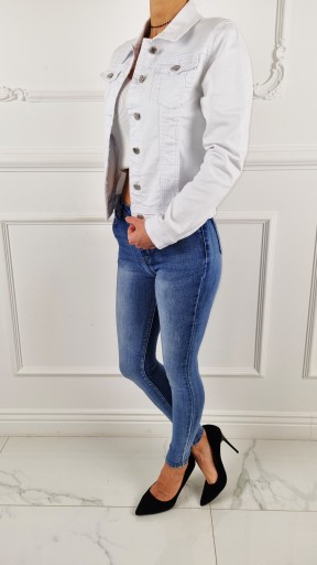 - Jeans Biały, zapinana na srebrne metalowe guziki.