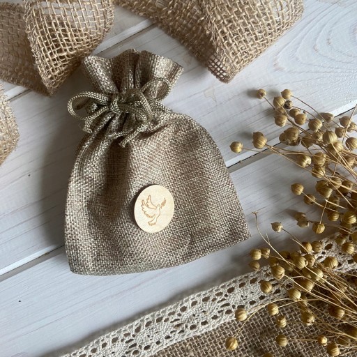 Oferowana kartka znajduje się w ozdobnym woreczku jutowym.