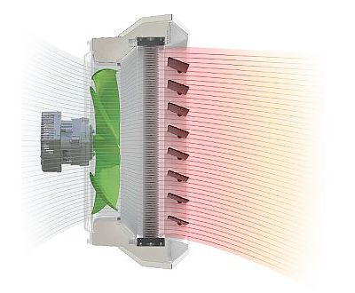 Dokładnie spasowana obudowa wentylatora oraz specjalnie zaprojektowany dyfuzor zapewniają równomierny rozkład prędkości powietrza w wymienniku gwarantujący niewielkie opory przepływu oraz pełne wykorzystanie mocy nagrzewnicy.