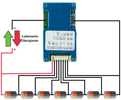 Obsługa 7 ogniw o łącznym napięciu znamionowym 25,2 V – 29,4 V (3,6V – 4,2V na ogniwo) z zabezpieczeniami, balanserem i zabezpieczeniem temperaturowym.
