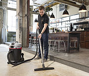 Optymalna obsługa dzięki przechowywaniu oprzyrządowania, zwijaniu kabla, przechowywaniu węża, pozycji parkowania rury ssącej i ergonomicznemu uchwytowi sprawiają, że ten odkurzacz nadaje się do profesjonalnego użytku. Sprawnie funkcjonujące gniazdo wtykowe umożliwia pracę dodatkowych maszyn czyszczących bezpośrednio z odkurzaczem.