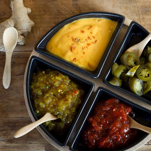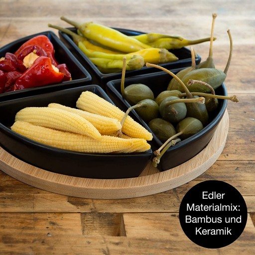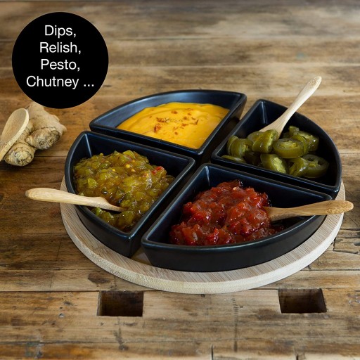 Praktyczne – zestaw miseczek do dipów i antypoślizgowych nóżek, miseczki do dipów nadają się do mycia w zmywarce i używania w kuchence mikrofalowej, bambusowe łyżki i łupkowe płyty łatwe do ręcznego czyszczenia