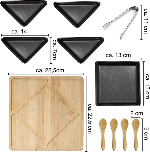 - Szlachetne serwowanie – 11-częściowy zestaw do serwowania firmy Moritz & Moritz składa się z 5 ceramicznych miseczek na przekąski z praktycznym talerzem z bambusa, w zestawie 4 łyżki do serwowania i 1 szczypce do serwowania. Idealny na każdy posiłek: śniadanie, kolację lub przekąski w międzyczasie