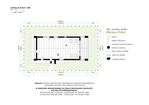 Min. szer. i dł. działki: 29,6 x 17,8 m
