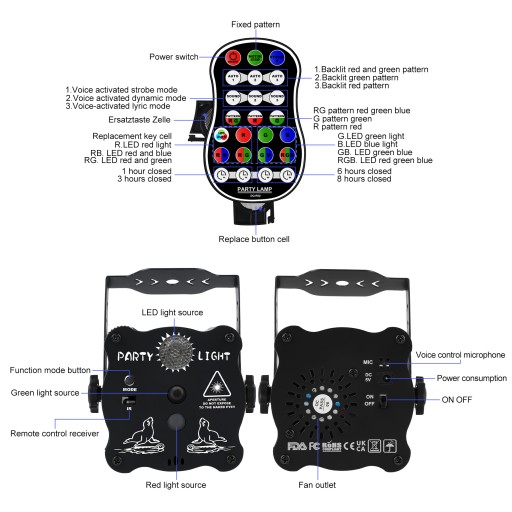 Lampy LED party mają 60 różnych wzorów w trzech kombinacjach świetlnych (czerwony, zielony, czerwony, zielony) i siedem kolorowych teł (czerwony, zielony, niebieski, żółty, cyjan, fioletowy i czarne światło). Światła i tła można dowolnie włączać lub wyłączać, takie połączenie wielu efektów tworzy bardziej trójwymiarową atmosferę i fajne sceny i doświadczać niezwykłych efektów świetlnych!