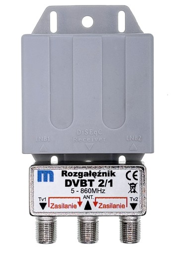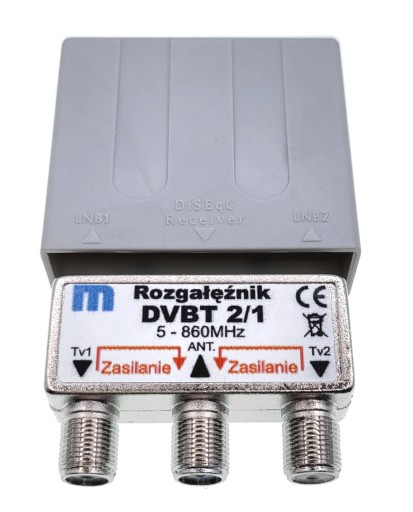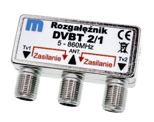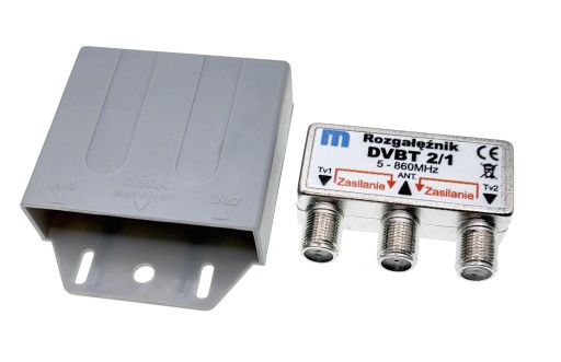 Rozgałęźnik antenowy pasywny indukcyjny (nie wymaga zasilania) do rozdzielenia sygnału DVBT2 na dwa odbiorniki lub połączenia dwóch anten do jednego odbiornika. Rozgałęźnik przepuszcza zasilanie w obu torach.