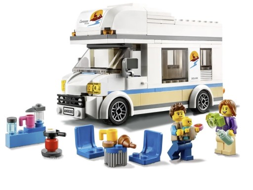 - Co jest w pudełku? Znajdziesz tam wszystko, co potrzebne do zbudowania świetnego kampera z bogatym wyposażeniem, a do tego minifigurki mamy i taty oraz słodką figurkę dziecka.