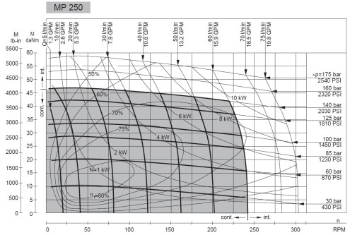 Obok znajduje się charakterystyka uniwersalna silnika wyporowego MP 250 CD.