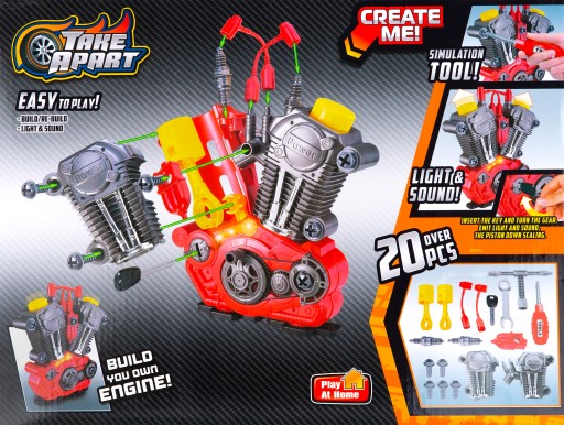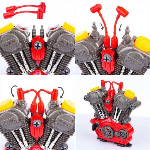 Silnik składa się z wielu elementów i uczy naszych dzieci poprawnego oraz prawdziwego funkcjonowania silnika tak jak jest to w rzeczywistości. Tłoki się obracają podczas kręcenia korbą. Silnik jest skręcany oraz rozkręcany, gdzie nasz mały mechanik musi sobie z tym poradzić.