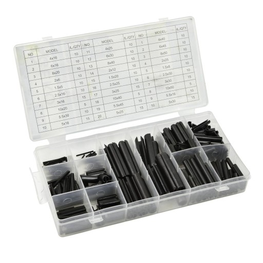 Zestaw kołków sprężystych rozciętych wzmocnionych. Zestaw składa się z 315 kołków w rozmiarach od 1,5x5mm do 10x50mm, wykonane ze stali sprężynowej. Całość zestawu umieszczona w wygodnym opakowaniu typu „sortownik” z tworzywa sztucznego.