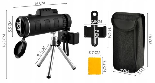 - SPECYFIKACJA - zakres szerokości telefonu: 57-90mm; powiększenie: 50x; odległość od źrenicy: 4mm; pole widzenia: do 9500m; wymiary całkowite (dł/szer/wys): 16/5,5/16,5cm; wymiary pokrowca (dł/szer/wys): 5/7/18cm; długość smyczy: 30cm; waga obiektywu: 300g; waga zestawu: 455g.