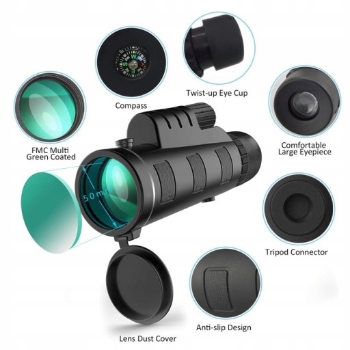 - PRAKTYCZNY – obiektyw jest lekki, waży zaledwie 300g, więc korzystanie z niego nie stanowi problemu. Do zestawu dołączono pokrowiec, który ma możliwość przypięcia do paska spodni – włożymy do niego obiektyw wraz z innymi akcesoriami dołączonymi do zestawu. Do lunety możemy przyczepić smycz, która dodatkowo zwiększy bezpieczne przenoszenie sprzętu. Obiektyw posiada również zaślepki, które ochronią soczewkę przed zabrudzeniami. Produkt posiada wbudowany kompas, który będzie doskonałym gadżetem uzupełniającym podczas podróży – pozwoli na ciągłą kontrolę terenu, co jest dużym ułatwieniem dla osób, które kochają podróże. Pokrętło znajdujące się na obiektywie umożliwia wyostrzenie obrazu – pozwala na indywidualne dostosowanie do wady wzroku.