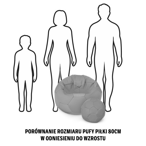Pufa piłka o średnicy ok. 80 cm + mała piłka o średnicy ok. 40 cm to wersja dla dzieci, starszej młodzieży i dorosłych. Z powodzeniem sprawdzi się w salonie, pokoju gier czy podczas czytania ulubionych książek. Pufy w tym rozmiarze bardzo często wykorzystywane są w chill out roomach. Są to najczęściej sprzedawane modele ze względu na swoją wielkość. Większość klientów, nawet dla małych dzieci wybiera właśnie ten rozmiar. Jest on najbardziej optymalny i służy wszystkim członkom rodziny.