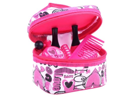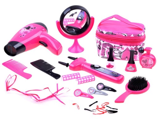 Po skończonej część elementów zestawu można schować do pojemnego materiałowego kuferka. Kuferek zapinany jest na zamek i ma wygodny uchwyt, dlatego łatwo go przenieść w inne miejsce. Ważnym elementem jest działająca suszarka i zaplatarka do włosów, dzięki czemu zabawa będzie jeszcze bardziej ciekawa.