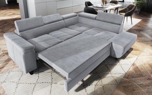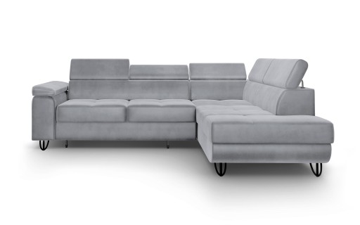 Narożnik tapicerowany z funkcją spania, regulowanymi zagłówkami oraz pojemnikiem na pościel