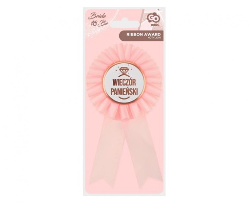 Różowy kotylion z napisem Wieczór Panieński ozdobiony taśmą, idealny dla przyszłej Panny Młodej.