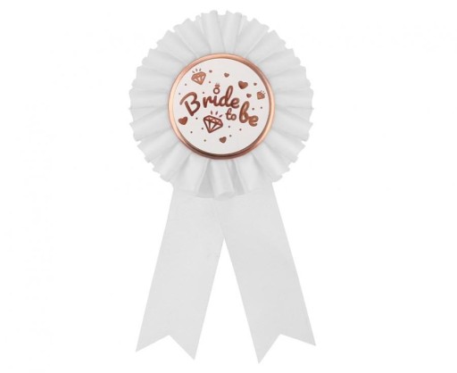 Różowy kotylion z napisem Bride to be ozdobiony taśmą, idealny dla przyszłej Panny Młodej na wieczór panieński.