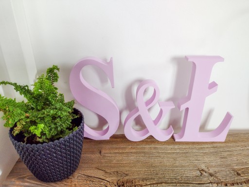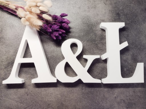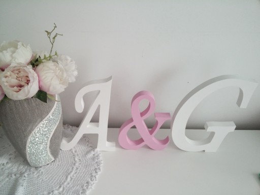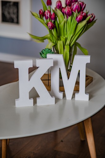 Litery są ręcznie malowane ekologiczną białą lub na życzenie kolorową farbą, przeznaczone do dekoracji wnętrz, w postaci różnorodnych napisów bądź inicjałów ślubnych i narzeczeńskich.