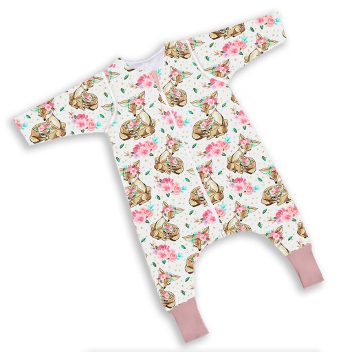 - Śpiworek z nogawkami ma dużą tolerancję rozmiarową, ponieważ nadmiar tkaniny zatrzymują nogawki, dzięki czemu dziecko może wykorzystać śpiworek w niejednym sezonie, a nogawki można podwinąć.