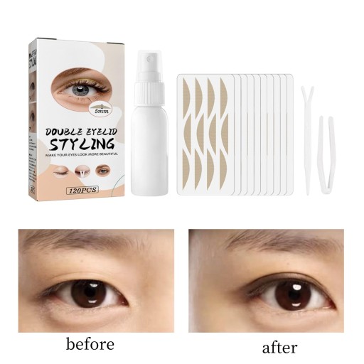 Opakowanie: zawiera 120 sztuk niewidocznych podwójnych naklejek na powieki, widelec, małą pincetę i butelkę z rozpylaczem.