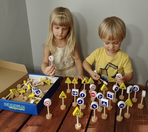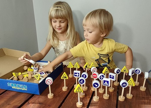 Zestaw drewnianych znaków drogowych. Pomoże w nauce zasad ruchu drogowego i uatrakcyjni zabawę samochodzikami. Zestaw zawiera 50 dwustronnych znaków na podstawkach.