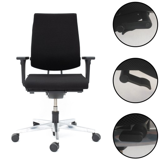 - pełen zakres regulacji: siedzisko (przód-tył, kąt nachylenia), podłokietniki (góra-dół, przód-tył), oparcie (kąt nachylenia, regulacja w odcinku lędźwiowym, możliwość blokady w dowolnym ustawieniu)